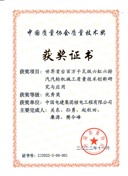 日前,2022年度中國質(zhì)量協(xié)會(huì)質(zhì)量技術(shù)獎(jiǎng)項(xiàng)目獎(jiǎng)獲獎(jiǎng)名單公布,公司組織申報(bào)的“世界首臺(tái)百萬千瓦級(jí)六缸六排汽汽輪機(jī)施工質(zhì)量技術(shù)創(chuàng)新研究與應(yīng)用”榮獲“質(zhì)量技術(shù)優(yōu)秀獎(jiǎng)”,實(shí)現(xiàn)了公司在“質(zhì)量技術(shù)獎(jiǎng)”領(lǐng)域零的突破。該獎(jiǎng)項(xiàng)的獲得,是公司近年來不斷強(qiáng)化質(zhì)量品牌建設(shè),提升質(zhì)量管理水平,大力弘揚(yáng)工匠精神,推進(jìn)技術(shù)創(chuàng)新推用,質(zhì)量技術(shù)管控能力不斷提升的體現(xiàn)。